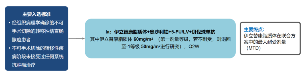 研究设计:这是一项多中心的I期临床试验,由复旦大学附属中山医院的刘天舒主任牵头,纳入既往未接受过转移性疾病系统性治疗的结直肠癌患者。研究Ia阶段为伊立替康脂质体的剂量递增研究,患者接受伊立替康脂质体联合奥沙利铂、5-FU/LV和贝伐珠单抗方案治疗。
