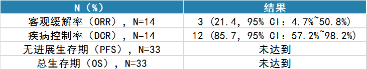 研究结果:截止2024年6月14日,共入组33例受试者。有14例受试者接受过至少一次影像学评估。所有患者中位随访时间51.0天(范围:1.0-115.0天),3例受试者疾病进展,主要疗效结果见表1。
