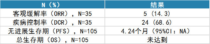 研究结果:自2023年10月11日至2024年6月13日,队列二共入组105例受试者。入组的受试者中,最常使用的治疗方案为Nal-IRI+氟尿嘧啶类(53/105,50.5%)和Nal-IRI+奥沙利铂+氟尿嘧啶类(23/105,21.9%)。有35例患者接受过至少一次影像学评估,15例受试者出现疾病进展或死亡,中位随访时间为1.31个月。主要疗效结果见表2。