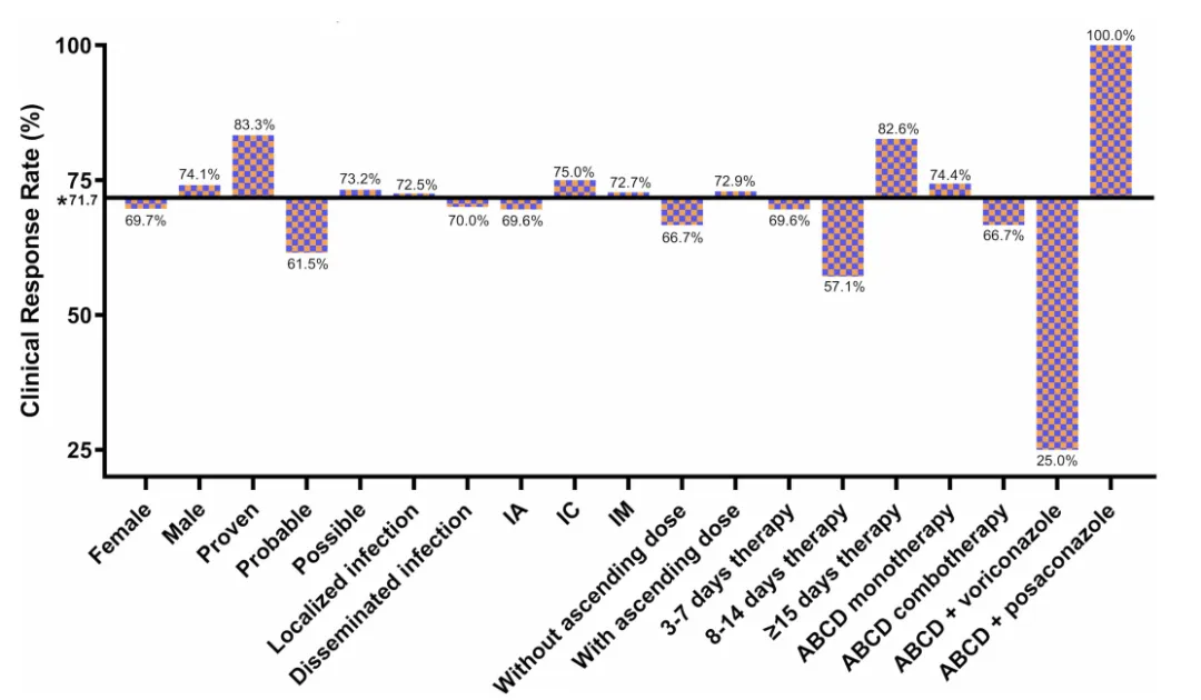 在纳入的60例患者中,ABCD的临床应答率为71.7%(43/60;95% 置信区间[CI]:59.2%~81.5%)。ABCD单药治疗和联合治疗的临床应答率分别为74.4%(29/39)和66.7%(14/21),差异无统计学意义(P=0.528)。各亚组患者的临床应答率见图1,亚组分析显示,性别、基础疾病、感染部位及既往抗真菌治疗均未对疗效产生显著影响。肝毒性、肾毒性和输注相关反应的发生率分别为13.3%、23.3%和1.7%。