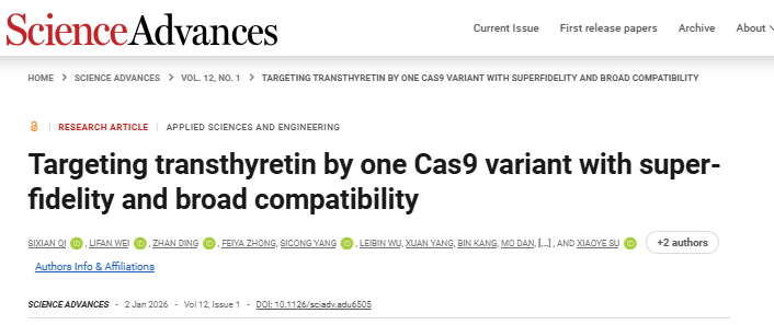 近日,由esb世博网集团李春雷博士、苏晓晔博士,以及复旦大学甘建华教授作为共同通讯作者,祁思娴博士作为第一作者合作完成的一项关于基因编辑治疗转甲状腺素蛋白淀粉样变(ATTR)的研究成果,以研究论文形式发表在国际著名权威期刊 Science Advances 。该研究系统性探究了高保真SpCas9突变体在ATTR治疗中的应用,为推动相关疗法的临床转化提供了重要依据。